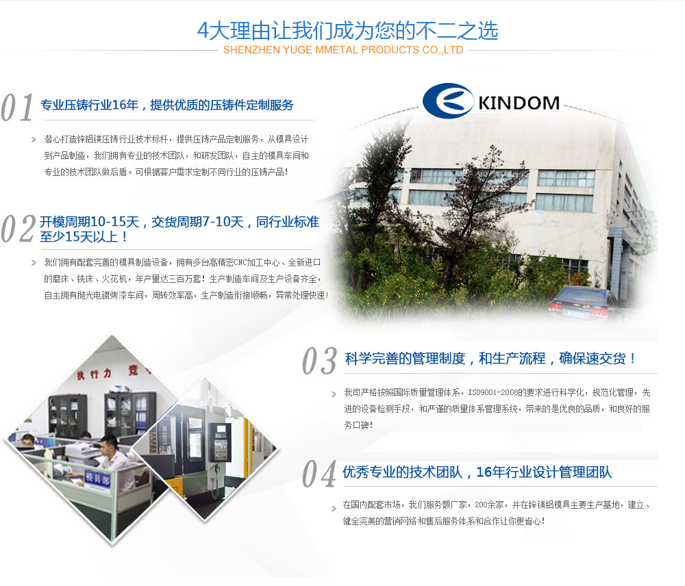 公司坐落在美麗的觀潮勝地海寧連行經濟開發(fā)區內,距杭州18公里,緊靠杭州繞城高速(G2501)下沙出口,距江東汽車產業(yè)園10公里。公司占地面積33000平方米,廠房建筑面積15050平方米。擁有各種高低噸位的著名品牌壓鑄件15臺(其中800T壓鑄機2臺、500T壓鑄機2臺、280T壓鑄機5臺、135T壓鑄機6臺),還有高精密自動沖床、高精密度多軸鉆床、切邊機、表面處理等設備20余臺。公司擁有三坐標測量儀、光譜分析儀、硬度拉力試驗機等精密計量檢測設備。